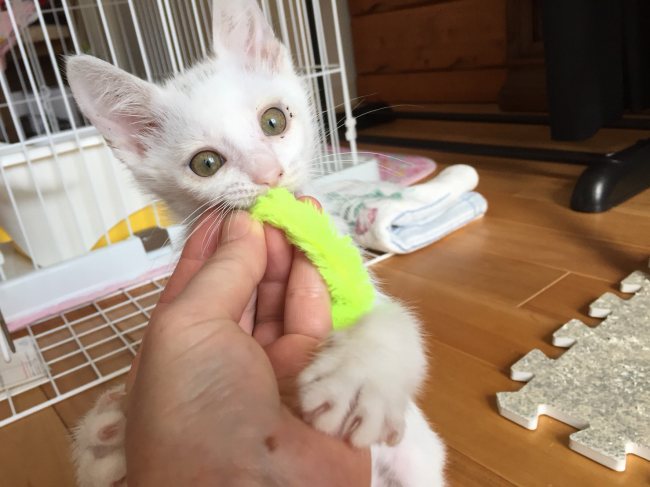 仮名:メロディー(仮名) 2018年5月生まれ/体重:300g(保護当初)→800g(7月中旬)/男の子/白(頭に黒模様あり)